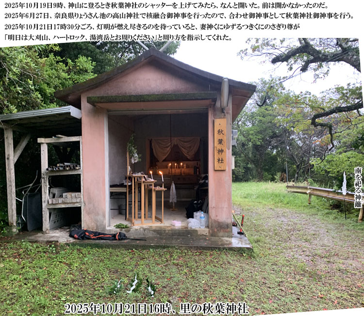 2025年10月19日16時10分、里の神山で祭壇を設ける場所を定めたのだが、帰る時、国常立大神さまの妻神、豊雲野大神さまが私を見送ってくださった。
