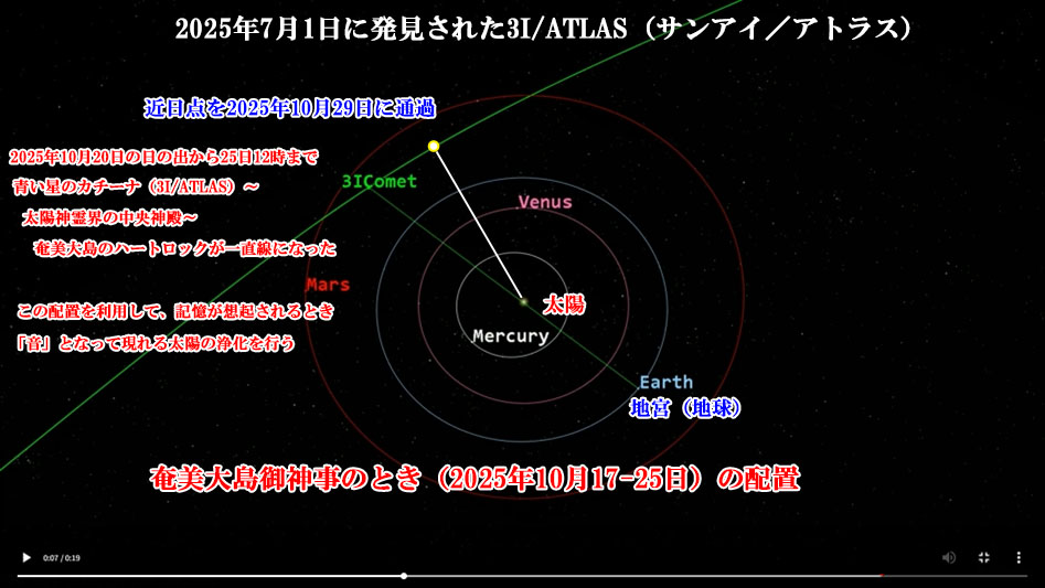 2025年7月1日に発見された「3I(さんアイ)アトラス」の磁場を、2025年10月20日の日の出から10月25日12時まで、太陽神界の中央神殿を通過させ奄美大島の要所に導き入れることができた。