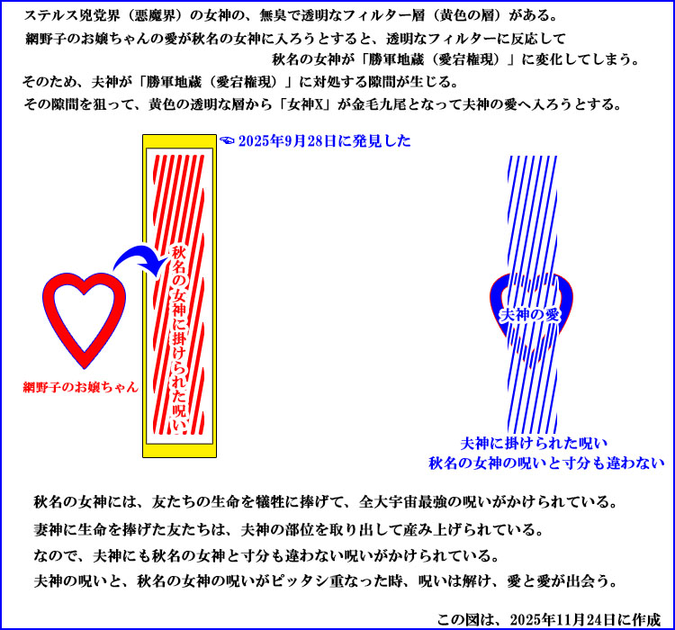 (5)2025年10月20日16時、前項で取り決めた≪数ある誓いのなかで、どういう誓いを優先すべきかの大原則≫に則って、国常立大神さまの陣頭指揮のもと、「あめゆずるひあめのさぎり尊」と網野子のお嬢ちゃんの結魂式を挙げた。