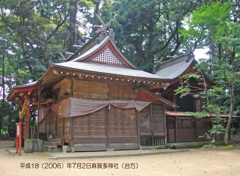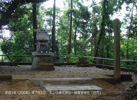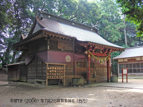 ~~~~~~~~~~~~~~~~~~~~~~~~~~~~~~~~~~~~~~~~~~~~~~~~~~~~~~~~~~~~~~~~~~~~~~~~~~ 本殿向かって右奥に摂社『天之日津久神社』という小さな社がある。 昭和19(1944)年6月10日に岡本天明がこの社に参拝に来て、社務所で休んでいるとき、『日月神示(ひふみ神示)』の自動書記が始まった。 至恩郷(三重県菰野郡菰野町)に祀られている月の宮(我家の記念写真です恐縮ですが)は、平成6年11月11日の麻賀多神社(成田市台方)の祭典に使用した廃材を頂戴し、それを材料に平成7年8月6日に落成した第二神殿のことです。 ちなみに平成10年3月23日午前11時5分、ある方が至恩郷に訪ねて来られ敷地に足を踏み入れようとすると、敷地を掃除していたお手伝いの青年の箒の先から火が走り、日の宮、天明画室、道場が全焼してしまったそうです。 しかし、この麻賀多神社からの廃材で建てられた月の宮(平成7年8月6日落成)だけが消失から免れています。 (この注は平成16年5月私が記す) |