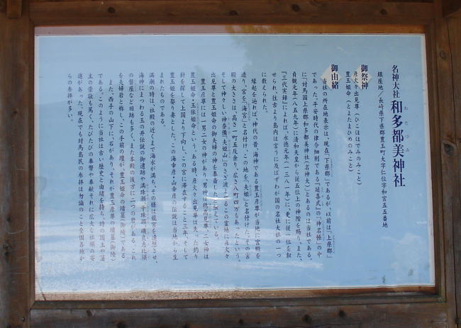 御由緒 当社の所在地表示は現在「下県郡(しもあがたぐん)」であるが、以前は「上県郡(かみあがたぐん)」であった。平安時代の律令細則である『延喜式』の神名帳の中に「対馬国上県郡和多都美神社(名神大)」とあるのは当社である。 貞観元年(859年)に清和天皇から従五位上の神階を賜り、また、『三代実録』によれば、永徳元年(1381年)に、更に従一位を叙せられ、往古より島内は言うに及ばずわが国の名社大社の一つに数えられた。 縁起を辿れば、神代の昔、海神である豊玉彦尊(とよたまひこのみこと)が当地に宮殿を造り、宮を「海宮(わたつみのみや)」と名付け、この地を「夫姫(おとひめ)」と名付けた。 その宮殿の大きさは、高さ一町五反余り、広さ八町四方もあったという。そして神々しい神奈備(かんなび)「夫姫山(おとひめさん)」のさざ波によるこの霊地に彦火火出見尊(ひこほほでみのみこと)と豊玉姫命(とよたまひめのみこと)のご夫婦の神を奉斎したと伝えている。 豊玉彦尊には、一男二女の神があり、男神は穂高見(ほだかみ)尊、二女神は豊玉姫命(とよたまひめのみこと)・玉依姫命(たまよりひめのみこと)という。 ある時、彦火火出見尊(ひこほほでみのみこと)は、失った釣り針を探して上国より下向し、この宮に滞在すること3年、そして豊玉姫を娶り妻とした。この海幸彦・山幸彦の伝説は当地から生れたものである。 満潮の時は、社殿の近くまで海水が満ち、その様は龍宮をを連想させ、海神にまつわる玉の井伝説の御遺跡や満珠瀬(みつたませ)、干珠瀬(ひるたませ)、磯良恵比須(いそらえびす)の磐座など旧跡も多く、また本殿後方に二つの岩がある。これを夫婦岩と称し、この手前の檀が、豊玉姫命の墳墓(御陵)である。 また、西手の山下に、石があり、それが豊玉彦尊の墳墓(御陵)である。 このように当社は古い歴史と由緒を持ち、時の国主や藩主の崇敬も篤く、たびたびの奉幣や奉献それに広大な社領の寄進があった。 現在でも対馬島民の参拝は勿論のこと全国各地からの参拝が多い。 |