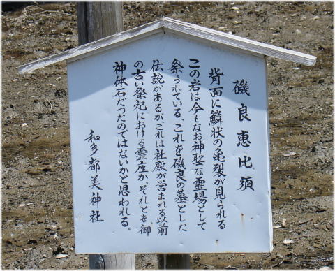 神話の豊玉媛は出産に際し、八尋の鰐(一書には蛇)になったというが、この霊石はまさに渚にあり、神話の御子神を具現したものにほかならない。 海神宮を「いろこ(鱗)の宮」と称したゆえんも、これがシンボルかと考えられる。 ●当地の俗伝に、和多都美の神は白い蛇と伝えられ、宮司の長岡家の世継ぎには背中に鱗があるという。 また長岡家の家法として、出産に際して和多都美様に箒を上げる習俗など、豊玉姫の故事に由来する伝承とみられ、当社を海神(わたつみ)の本宗とするにふさわしい所伝といえよう。 ●境外の浜辺には、御子出誕の伝説地「玉ノ井」があり、海中に満珠瀬(みつたませ)・干珠瀬(ひるたませ)がある。 この入り江のたたずまいと、海宮の伝説、祭祀の古跡などからみて、この地を海神祭祀の本拠とした説が行われている。 (文献) 川本達『海神宮考』 田中卓『住吉大社史』 住吉大社史〈上巻〉 (1983年) 住吉大社史〈下巻〉 (1983年) 永留久恵『対馬の神々』 海神と天神―対馬の風土と神々 海童と天童―対馬からみた日本の神々 |
